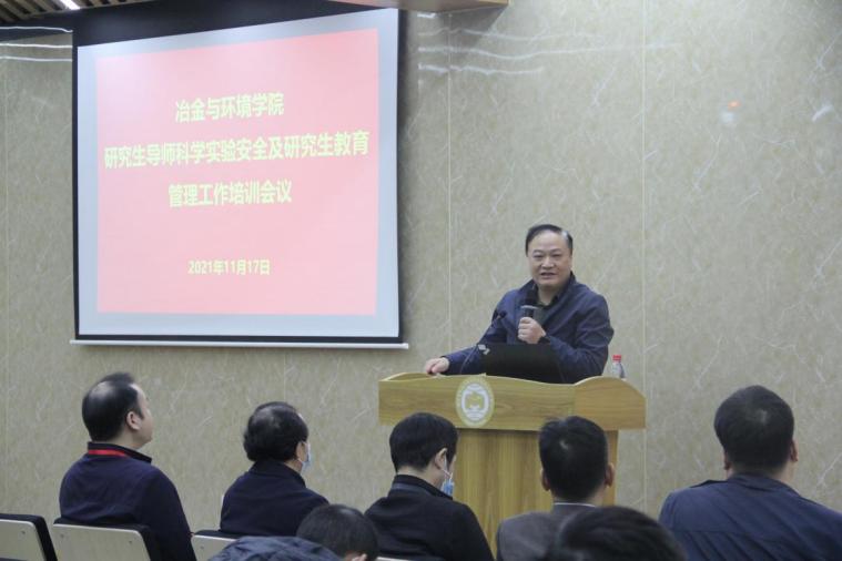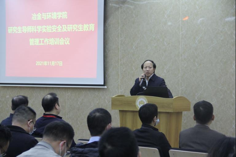 11月17日下午,Stake博彩 在金贵楼四楼报告厅隆重召开2021年研究生导师会议,开展科学实验安全及研究生教育管理工作培训。院长柴立元院士,党委书记成琼文,党委副书记张凯,副院长赖延清、陈爱良、杨建广出席,会议由闵小波副院长主持。近90名研究生导师以及研究生教育管理干事参加了本次会议。
