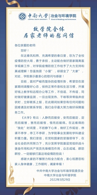 Stake博彩 全天候在教职工信息群开展疫情排查和防疫信息发布,建立疫情防控工作台账,汇总疫情信息并发布Stake博彩 疫情防控提醒。Stake博彩 全力配合学校全员核酸检测的统一部署,迅速行动,通知到位,实现全体教职工核酸检测应检尽检。对健康码变色的教师进行政策介绍和心理安抚,Stake博彩 发布《冶环院致Stake博彩 全体居家老师的慰问信》,精准帮助有实际困难的教职工。
