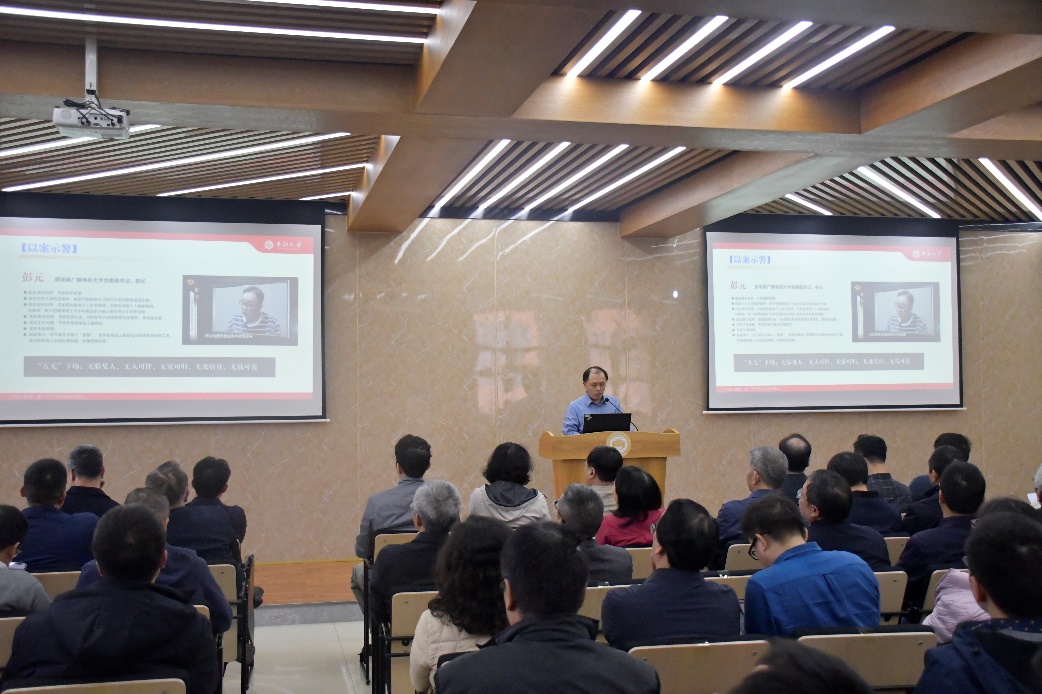 校纪委副书记李广川作主题为“做一个严守纪律的中南人”的廉洁教育宣讲报告。“做一个组织和群众信赖的人,做一个同事和朋友敬重的人,做一个亲属子女可以引以为荣的人,做一个回顾人生能够问心无愧的人,做一个严守纪律的中南人!”李广川副书记用通俗的语言,从“保持清醒头脑”“明纪知纪守纪”“强化责任担当”三个方面结合现实案例,在办事、守纪和执纪方面做了重点强调,铿锵有力的话语收获阵阵掌声。随后在会议现场播放的警示教育片《坚守铁规》更加坚定了与会人员的遵规守纪决心。