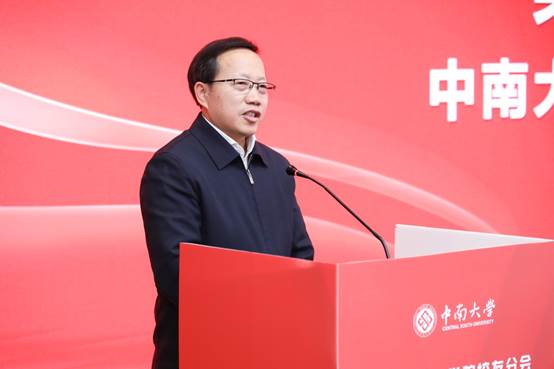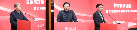 校友代表瑞普兰钧能源股份有限公司董事长曹辉讲话,他感谢母校的培养,中南“知行合一,经世致用”的校训一直在激励自己前行,表示会努力为校友会提供支持平台。