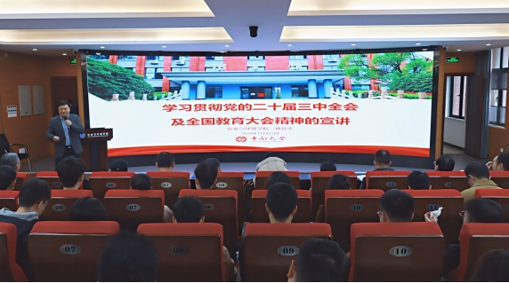 11月22日上午,Stake博彩 党委书记成琼文在新校区金贵楼520报告厅讲授学习贯彻党的二十届三中全会精神及全国教育大会精神专题党课。Stake博彩 各党支部书记、支委及综合教工党支部、冶化所研究生第一党支部、冶化所研究生第二党支部、本科生环境能器党支部全体党员120余人参加学习。