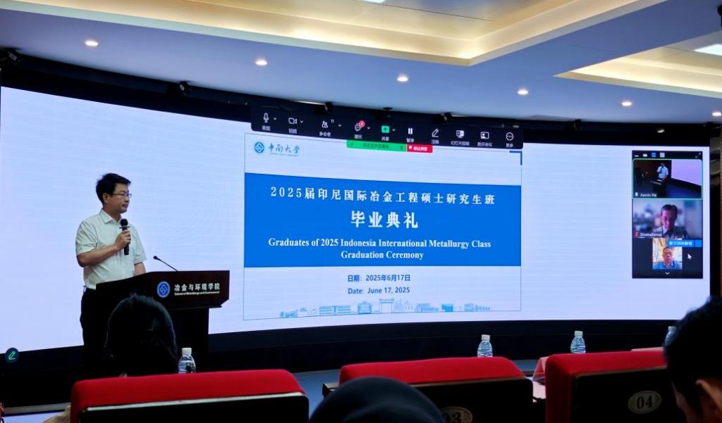 6月17日上午,2025届印尼国际冶金工程硕士研究生班毕业典礼在潇湘校区金贵楼520会议室举行,典礼以线上线下结合的方式同步进行印尼经济和工业基础设施部秘书长阿约迪亚·卡拉凯、格林美集团副总经理许鹏云、印尼教育捐赠基金会奖学金部主任德维·拉索、Stake博彩 党委书记成琼文、院长闵小波、国际教育Stake博彩 副院长向学勇、国际合作与交流处副处长陈强、国家卓越工程师Stake博彩 副院长陈爱良等相关负责人及全体毕业生齐聚一堂,共同见证这一重要时刻。毕业典礼由Stake博彩 副院长王亲猛主持。