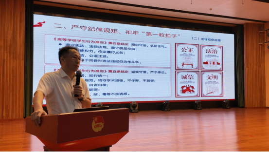 开学典礼后,Stake博彩 组织了新生入学教育。业务办与学工办老师分别就学术道德、资助政策、培养管理、思政及安全教育等内容进行讲解。中南大学心理健康教育中心王梦翔老师应邀开展心理讲座,帮助新生学会应对压力的方法。最后,党委副书记朱忠平作“扣好第一粒扣子”廉洁教育专题讲座,提醒新生增强法治观念、明确行为边界,为新生健康成长提供重要引导。
