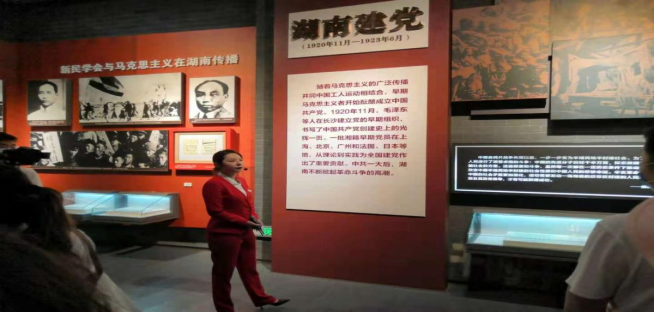 走进展厅,映入眼帘的是名为“潇湘魂”的毛泽东、刘少奇、任弼时伟人的雕像,三位伟人伟岸的形象近在眼前,令人倍感振奋,右侧中国共产党党旗鲜艳夺目,气氛庄重肃穆。省党史陈列馆展厅共分为三层,以“敢教日月换新天”为主题分成四个部分:前三部分按照历史发展脉络,分别以“开辟新天地”、“描绘新画卷”、“谱写新篇章”为题,展现了中国共产党领导湖南人民革命、建设、改革的三个历史时期;第四部分“三湘群英谱”采取专题形式,介绍了以毛泽东为代表的湘籍和长期在湘工作的370多位党史人物和2个群体。一幅幅泛黄的老照片、一件件承载了历史记忆的文物,立体、生动、形象地展示了中国共产党在湖南波澜壮阔而又绚丽多彩的光辉历史。在导游的带领讲解下,学员们一边走、一边看,一边感受,深刻领会了共产党人初心和使命,再一次接受了心灵上的净化和精神上的洗礼。